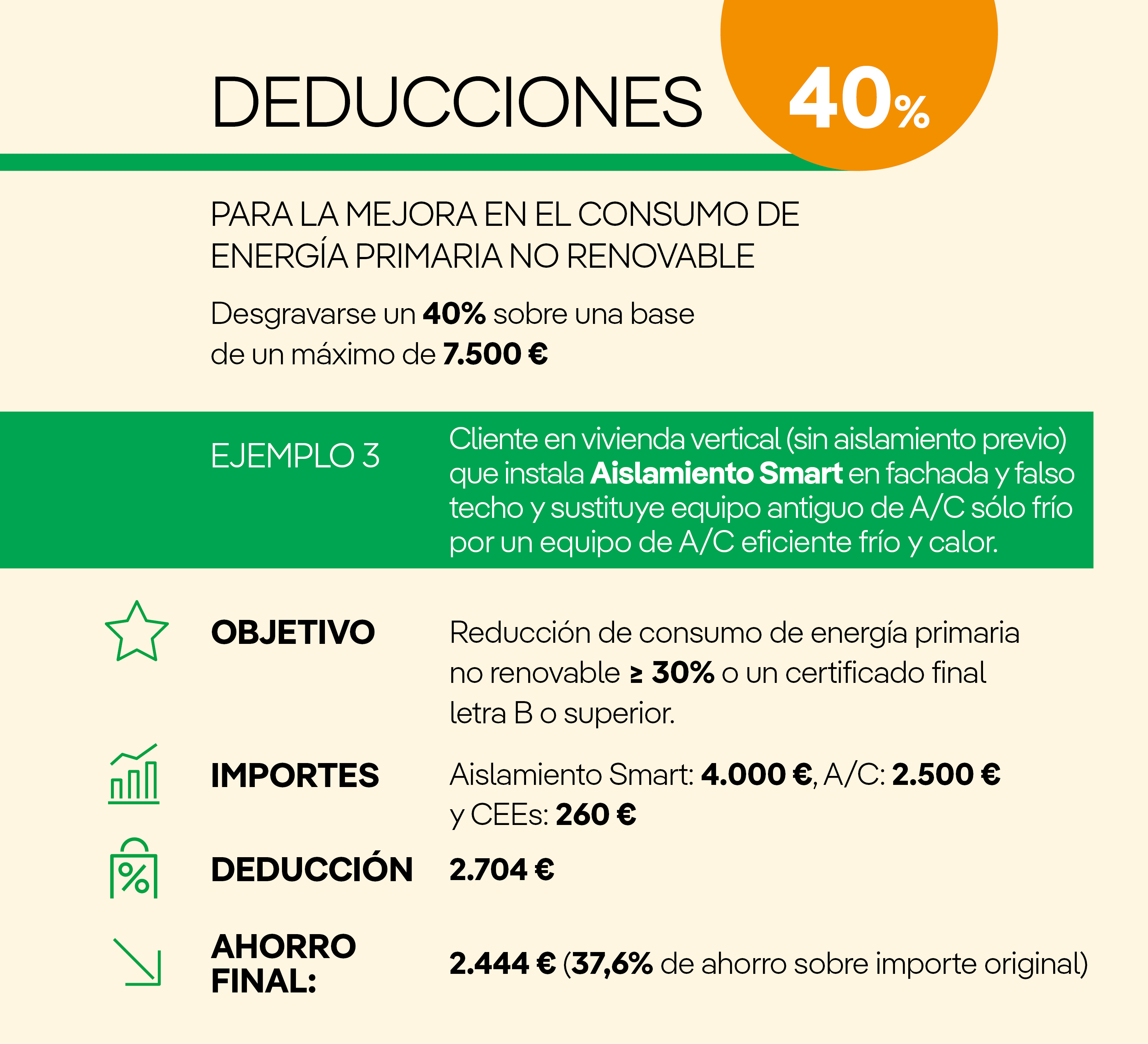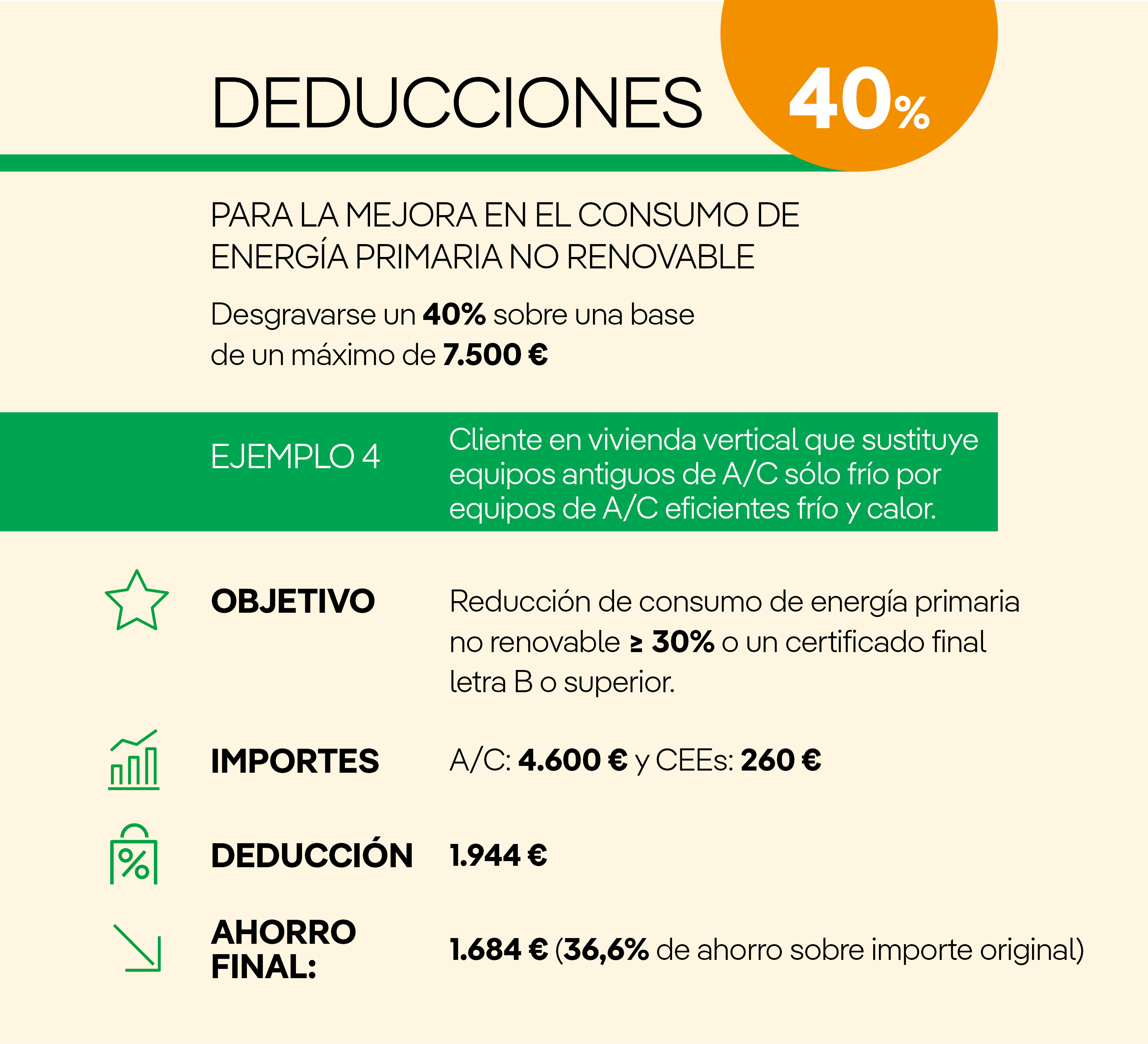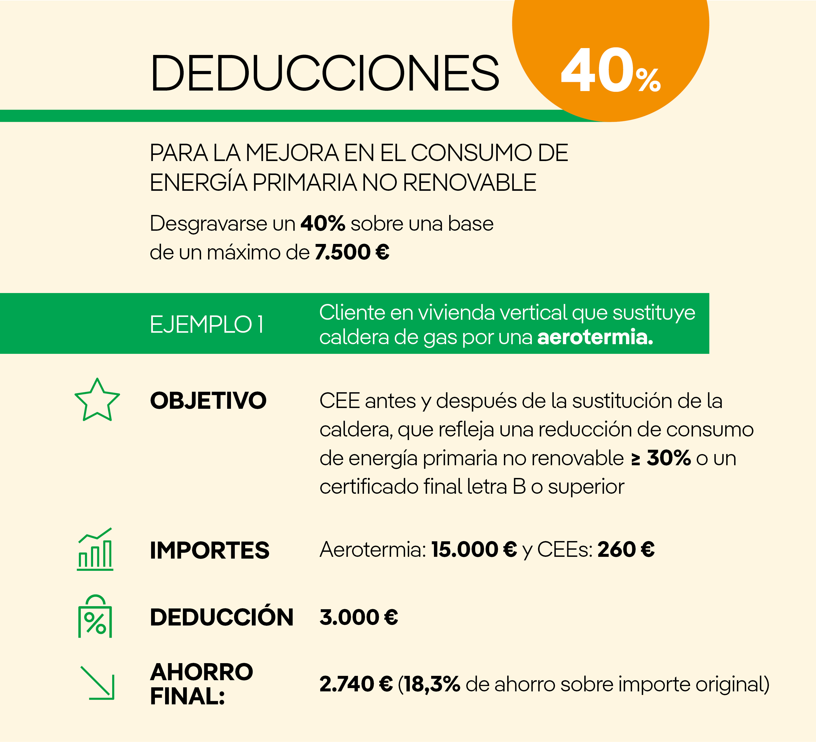 - Deducción del 40% por obras para la mejora en el consumo de energía primaria no renovable.